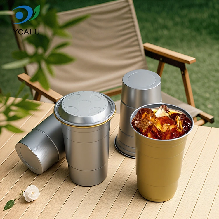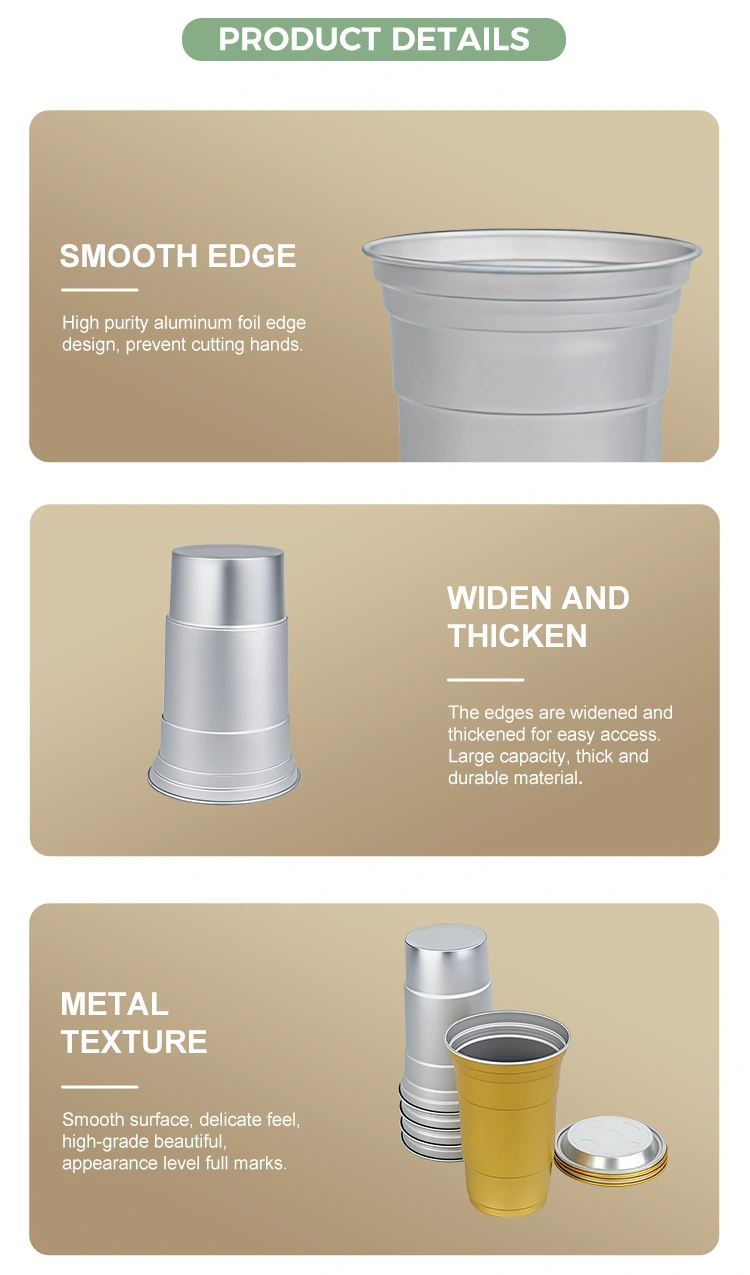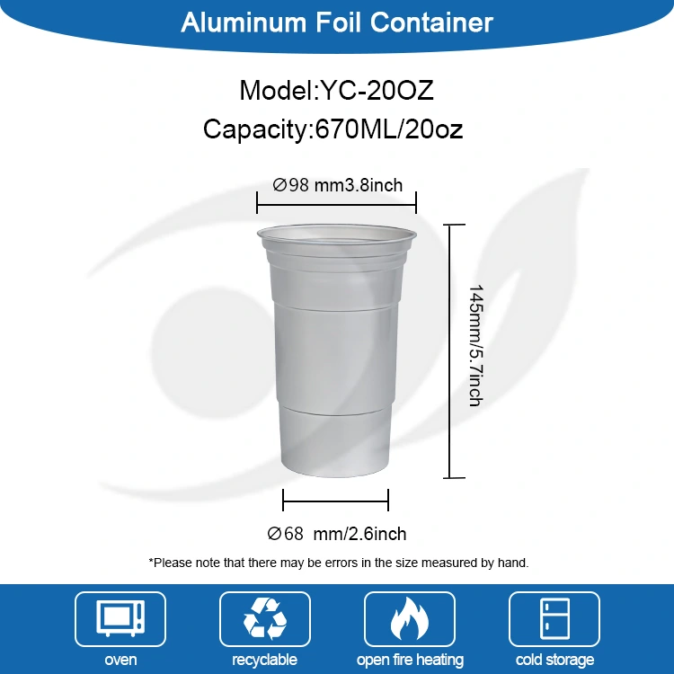YUNCHU 20oz engangs enkel drikkekopp i aluminium er spesialdesignet for moderne drikkebehov. Begerkroppen er laget av matkvalitets primær aluminiumsfolie av høy renhet, fri for BPA, og er trygg uten lukt. Den unike glatte valsede kanten og fortykningsprosessen sikrer komfortabel holding og forhindrer kutt. Denne 20oz engangsfestekoppen i aluminium