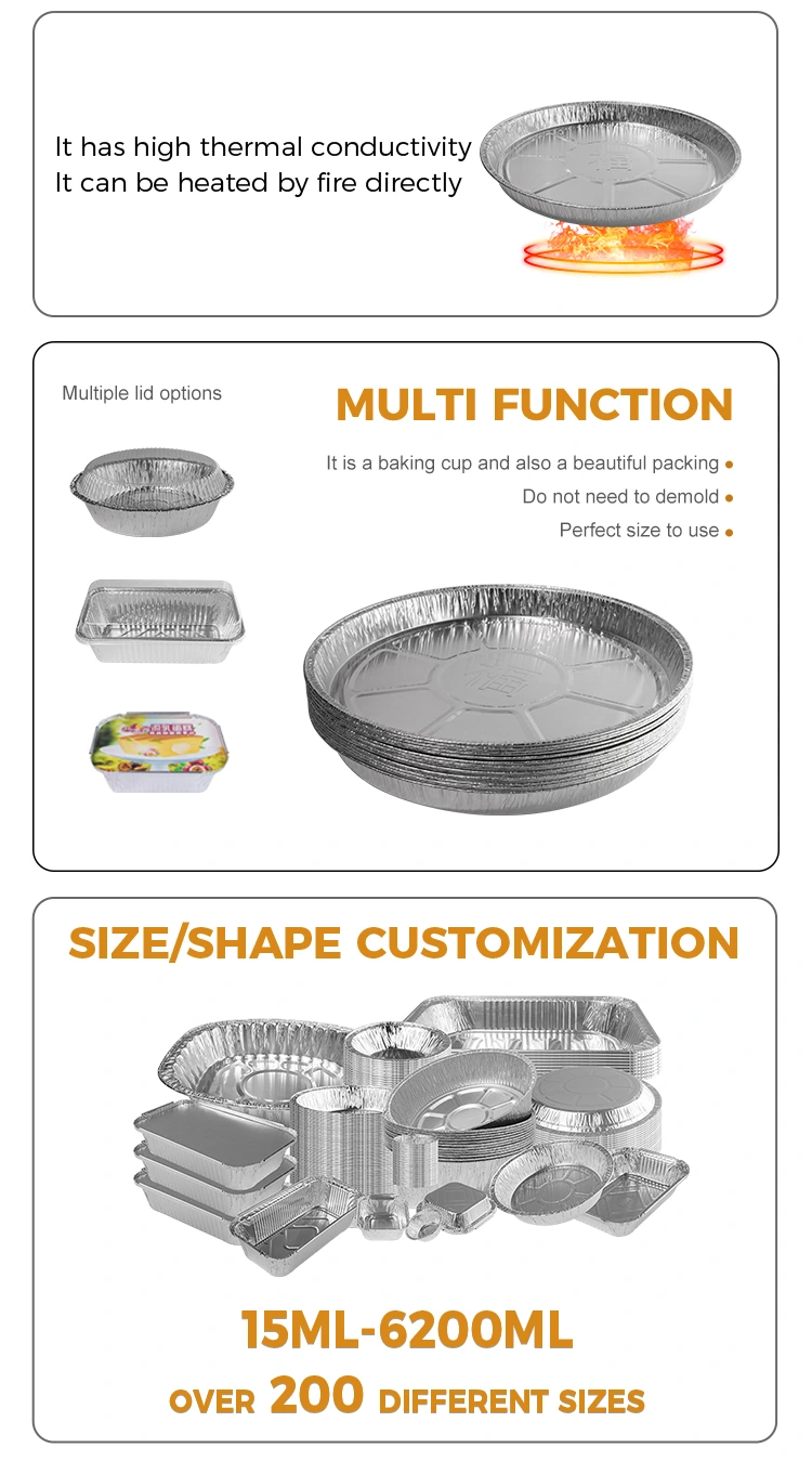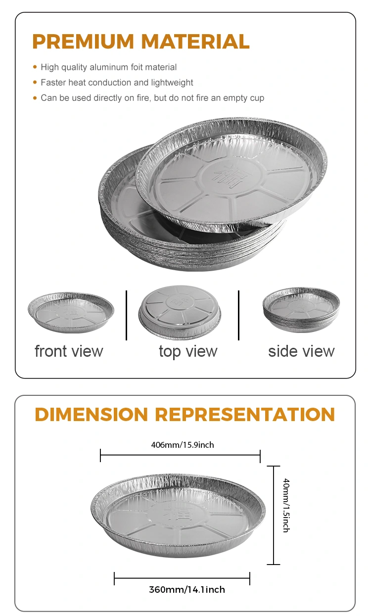 Yunchu Aluminium Foil Leverandør Model YR3700 Disponibel Air Fryer Oven Silver Aluminium Foil Food Container leveres. Beholderen har en diameter på 406 mm (ca. 15,9 tommer) på toppen, 360 mm (ca. 14,1 tommer) i diameter i bunnen, en høyde på bare 40 mm (ca. 130,5 tommer), og en kapasitet på omtrent 3 700 ml (ca. 130,5 oz). Åpen flammedamping er praktisk og hygienisk, ovnbaking, høye temperaturmotstand 400 ° C er ikke brent eller ødelagt, ovnsbaking er ikke klissete, ikke redd for fettete og forsettlig grillmat, på grunn av dens evne til direkte å kontakte åpne flammer, trenger brukere ikke å bekymre seg for sikkerhetsproblemer. Aluminiumsfoliebeholdere er motstandsdyktige mot høye temperaturer, svært motstandsdyktige mot baking, og er ikke lett å brenne eller bryte. Kanten av full rull er oljefri, og forhindrer at maten holder seg til gryten, og beskyttelsen er mer intim.