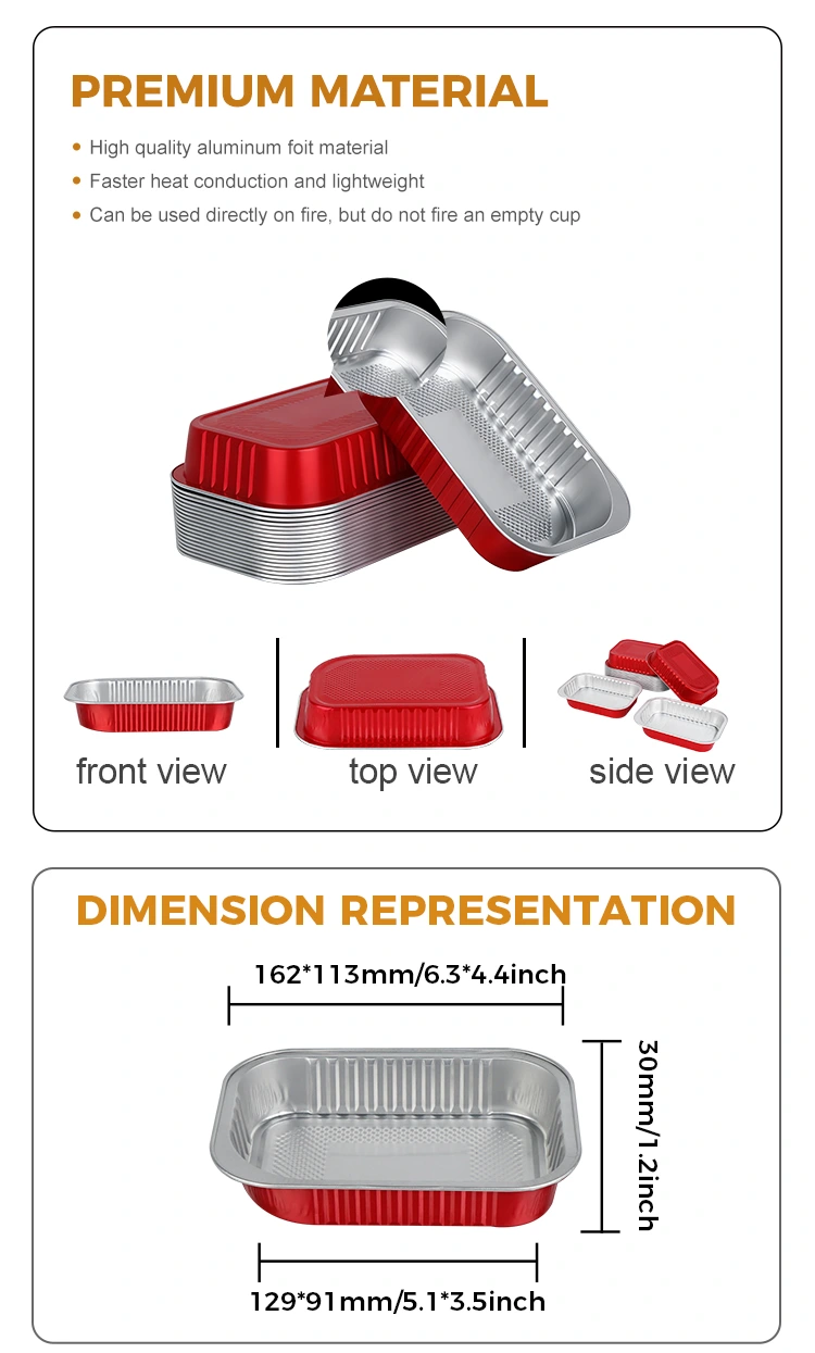 - Materialet i rektangelrød aluminium take-out-beholder kan låse inn ferskheten og friskheten til maten. Dens utmerkede varmelednings- og isolasjonsegenskaper gjør at den kan varmes opp direkte i ovnen, mikrobølgeovnen og avkjøles i kjøleskapet, og låser effektivt inn den originale smaken av måltidet og opprettholder den ideelle smaken i lang tid.