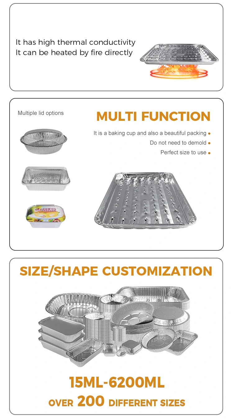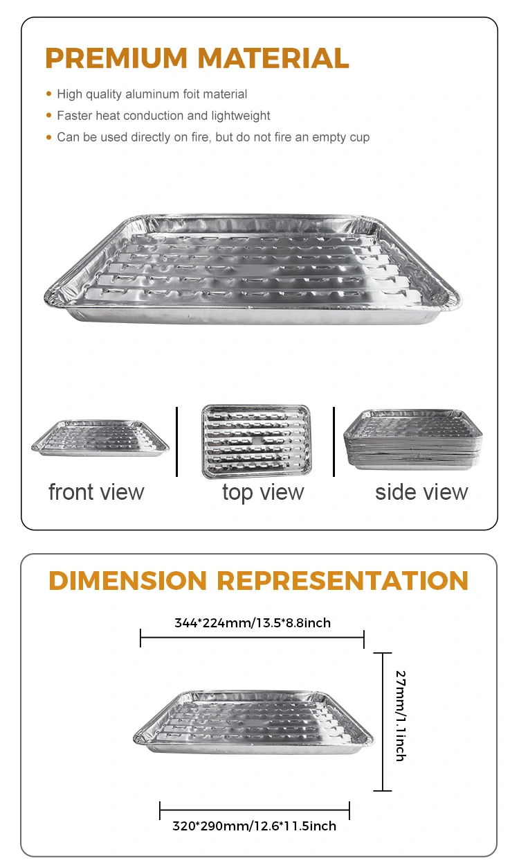 Yunchu aluminiumsfolieleverandør Engangsgrillpanne er egnet for utendørs og innendørs grilling, dette bakebrettet har et unikt hulldesign, ingen grunn til å bekymre deg for oljerøykproblem. Utformingen av hullene gir mulighet for rask varmeledning og mer jevn oppvarming, og unngår lokal overoppheting av tradisjonelle bakebrett. Enten det er camping i villmarken eller en familiesamling, gir denne grillen et rent, sunt miljø for grillen din. Yunchu aluminiumsfolie Disponibel grillpanne er laget av kontaktmaterialer for matkvalitet for å sikre hygiene og sikkerhet under grillprosessen. Aluminiumsfoliematerialet av høy kvalitet er ikke bare holdbart, men har også en glatt overflate og ingen lukt, slik at du kan glede deg over måltidet uten å bekymre deg for helserisiko. Denne bakepannen er designet med alle detaljer i tankene, fra utseende til praktisk.