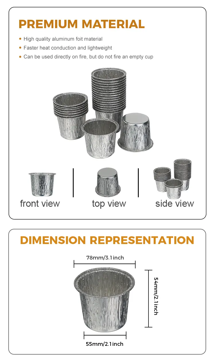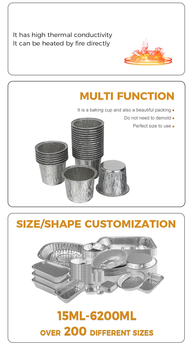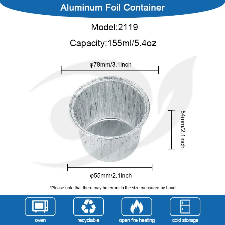 Yunchu aluminiumsfolieprodusentens engangs runde kakebeger sølv aluminiumsfoliebeholder er laget av matkvalitets høyrent aluminiumsfolie. Den har gjennomgått streng kvalitetstesting og har ingen lukt og ingen skadelige tilsetningsstoffer. Direkte kontakt med ingredienser gir mer trygghet og beskytter hver bit av søthet og helse. Den fortykkede aluminiumsfolieprosessen skaper en tøff koppkropp som ikke er lett å deformere eller bryte. Den kan brukes til ulike kakerører, mousse, pudding og andre ingredienser. Den tåler høye temperaturer opp til 250°C og lavtemperaturmotstand opp til -20°C for ovner, kjøleskap, luftfrityrere og andre apparater. Den kan godt tilpasses baking, kjøling og frysing. Det er ikke nødvendig å bytte ut aluminiumsfolieboksen, og det er ikke for mange kjedelige trinn. Den klassiske runde designen, koppens kropp er rund og glatt, og den matchende sølvmetalliske glansen krever ingen ekstra dekorasjon. Den kan serveres rett etter steking, og den vil ha en presentasjonseffekt på dessertbutikknivå. Munnen på koppen er fint krøllet, noe som gjør den glatt å ta på og ikke riper i hendene. Det hindrer røren i å lekke når den helles i, og gjør det lettere å fjerne formen.