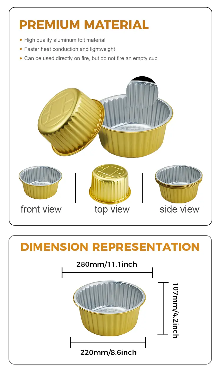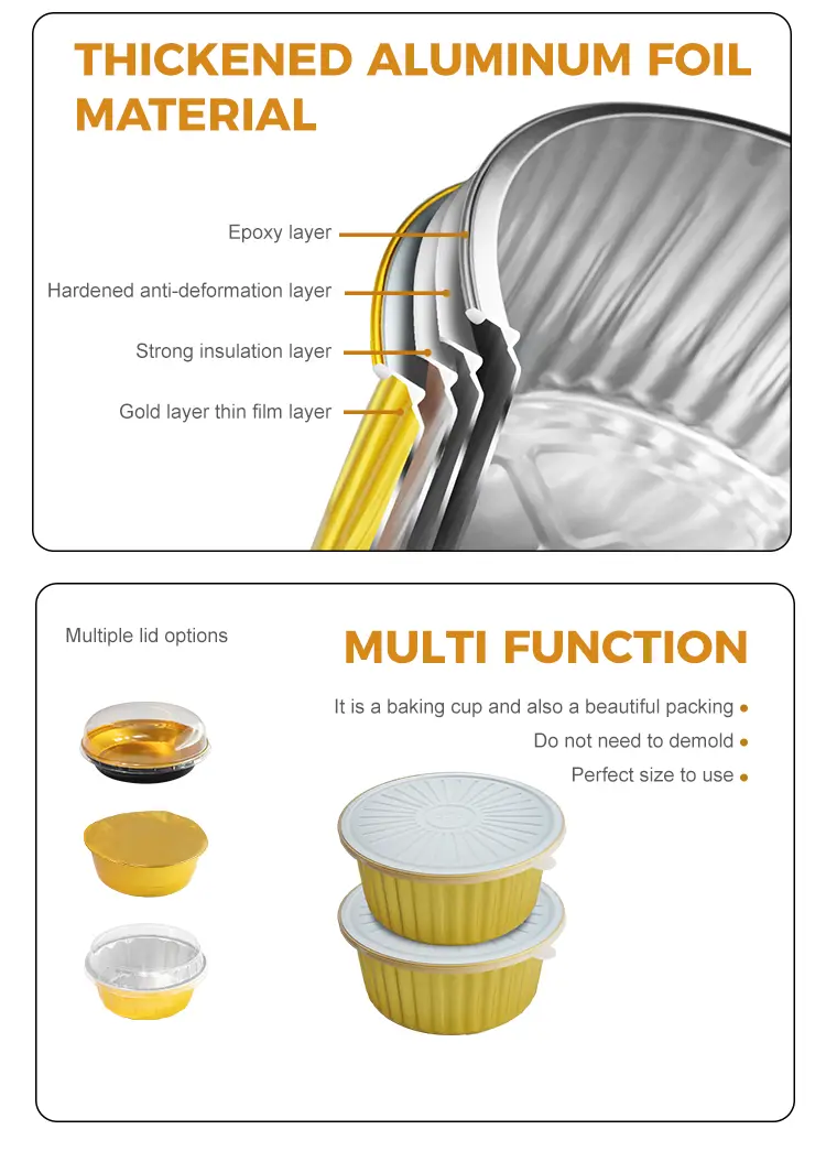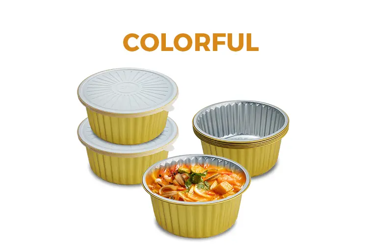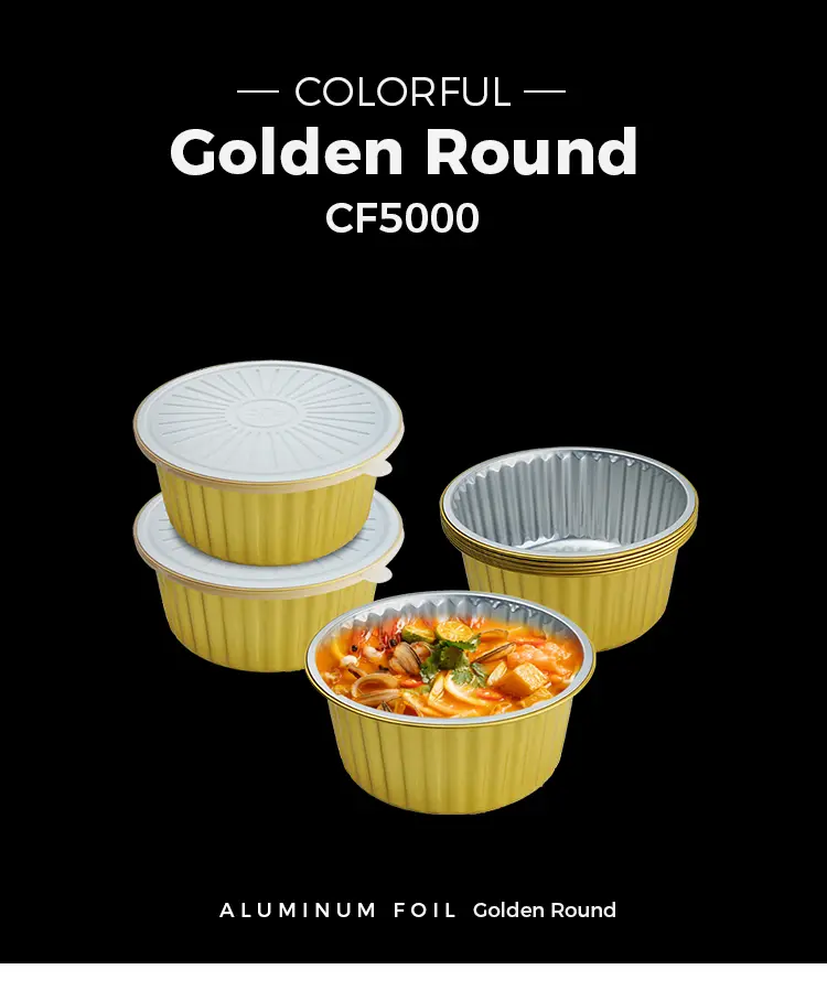• Engangsforsetningsbar gylden rund aluminiumsfoliebeholdereEngangsforsetningsbar gylden rund aluminiumsfoliebeholdere