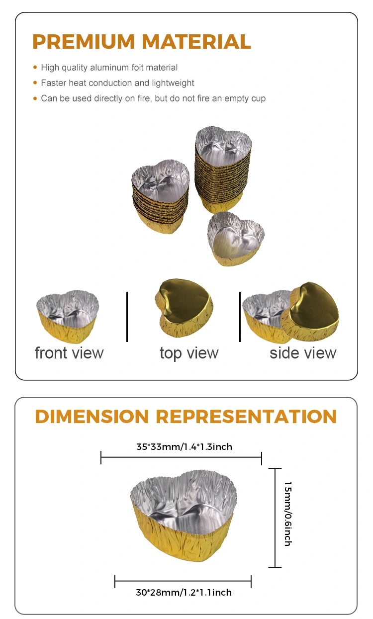 Yunchu aluminiumsfolie leverandør hjerteformet mini-bake sølv aluminiumsfolie matbeholder er veldig egnet for liten emballasje, bakerapplikasjoner, unik design, hjerteformet design, kan oppfylle en rekke bruk Andre matvarer fra å skli, og kan forbedre glidemotstanden, en rekke farger kan tilpasses.