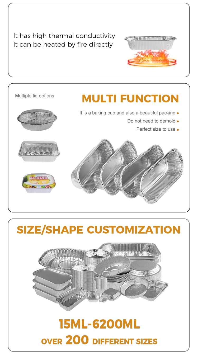 Den firkantede foliefoliebeholderen i Air Fryer Silver er laget av aluminiumsfoliemateriale av høy kvalitet, som er lett og holdbart. Toppen er utstyrt med et tilpassbart PET -gjennomsiktig lokk, og bunnen er utstyrt med et lokk som er presset og festet i sidekassen, som effektivt kan forhindre at maten holder seg til stekeplaten, noe som gjør det enkelt å frigjøre og rene, og samtidig lette transport og bruk.