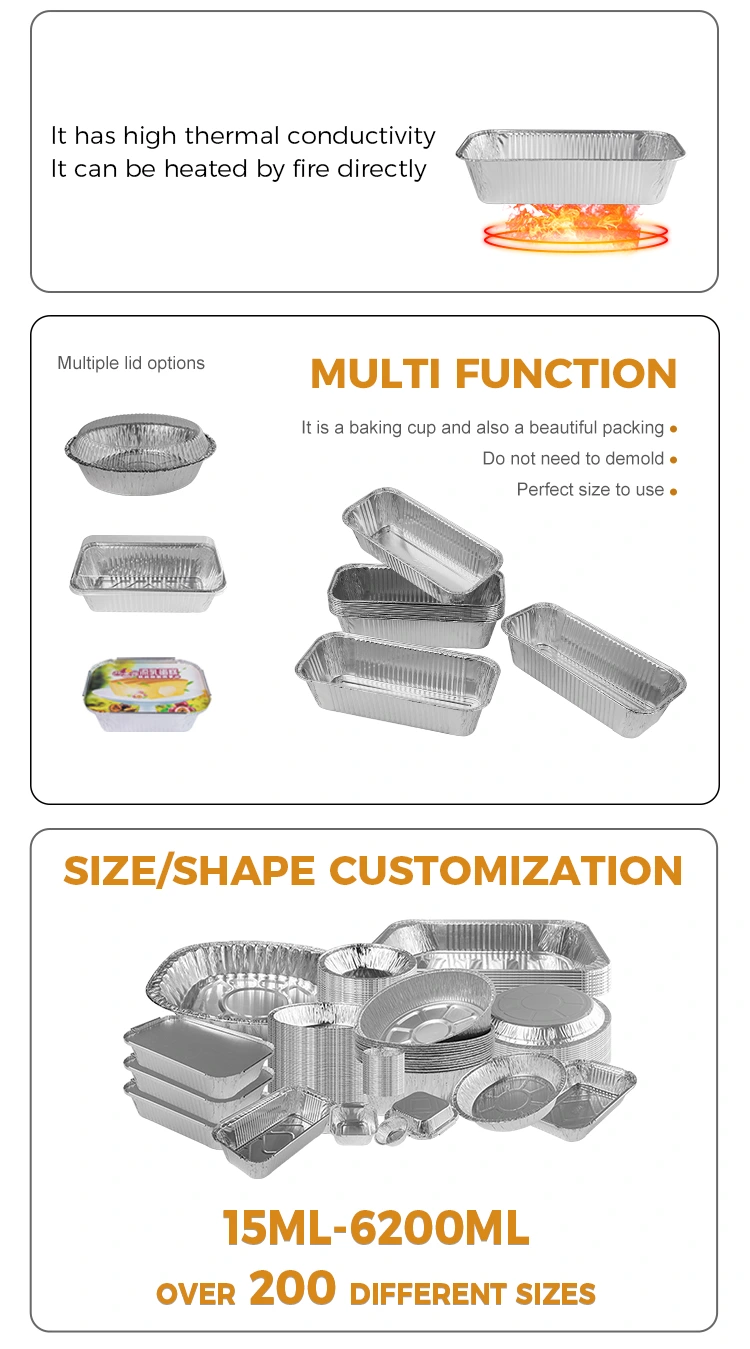 Yunchu aluminiumsfolie Leverandørmodell 2325 Rektangulær luft Fryer Takeaway Silver Aluminium Foil Containers Høy kvalitet aluminiumsfoliemateriale er tyknet og ikke lett å bryte, og kan varmes opp over en åpen flamme, denne aluminiumsfoliebeholderen er ikke bare vakker i utseendet, men også veldig praktisk. Den tåler bake med høy temperatur, ikke lett å brenne eller deformere bunnen, og utformingen av bunnen er også vakker og elegant, noe som effektivt kan forhindre at mat stikker. I tillegg gjør den høysidige designen aluminiumsfolie-kombinasjonen mer stabil og enklere å bruke. Uansett hvilken størrelsesspesifikasjon du velger, tilpasser denne aluminiumsfoliebeholderen seg perfekt til forskjellige grytestørrelser, og serverer dine mangfoldige behov. For å tillate flere forbrukere å glede seg over produkter og tjenester av høy kvalitet, tilbyr vi en rekke spesifikasjoner for størrelse å velge mellom, og kan tilpasse mønsterutskrift i henhold til dine behov for å imøtekomme personlige behov. Med en enkelt MOQ på bare 1000 stykker er kjøpsprosessen enkel og rask, og kostnadsytelsen er ekstremt høy. Hvis du har spørsmål eller trenger ytterligere forståelse av produktene våre, kan du gjerne kontakte oss, vi vil gjerne tjene deg.
