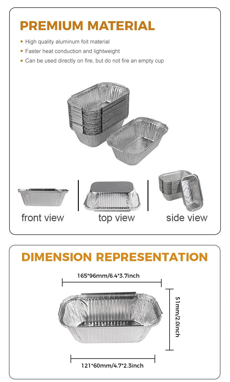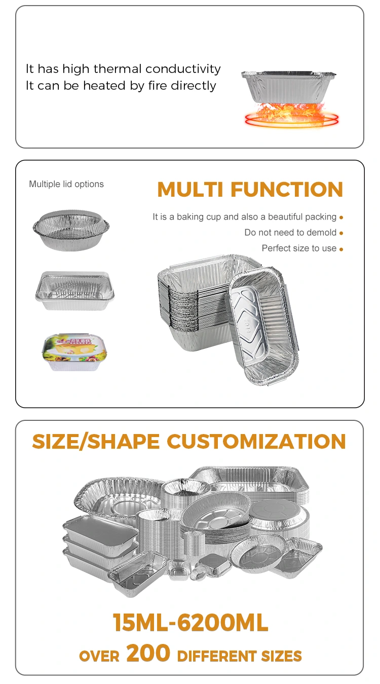 Funksjoner: Aluminiumsfolie -lunsjboksen vi tilbyr er laget av 8011 aluminiumsfolie -materiale, som har utmerket ytelse av varmebevaring og effektivt kan opprettholde temperaturen på maten, noe som gjør maten mer attraktiv. Spesielt har våre rektangulære bakt -rissesølv -aluminiumsfoliebeholdere ikke bare termiske isolasjonsegenskaper, men kan også kombineres med aluminiumsfolie lokk eller PET -plastlokk for å lette personlig tilpasning av logoer, og dermed forbedre kundens minnepunkter og forbedre merkevarebevisstheten.