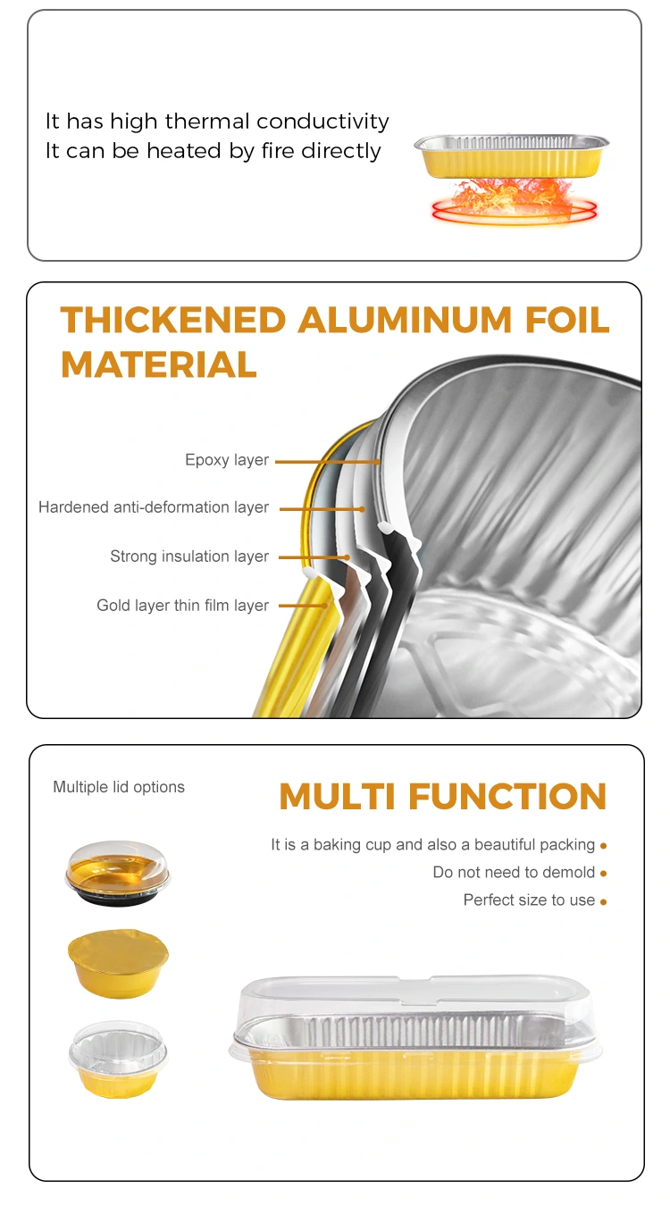 Yunchu aluminiumsfolie. og miljøvennlig, den konkave og konvekse designen i bunnen øker ikke bare stabiliteten til produktet, men spiller også en rolle i anti-slip; Stiverne på sidene forbedrer produktets stabilitet, noe som gjør det mer holdbart, og i tillegg tilbyr denne rektangulære lysveggede aluminiumsfoliebeholderen en rekke farger å velge mellom, slik at du kan tilpasse den i henhold til dine preferanser.