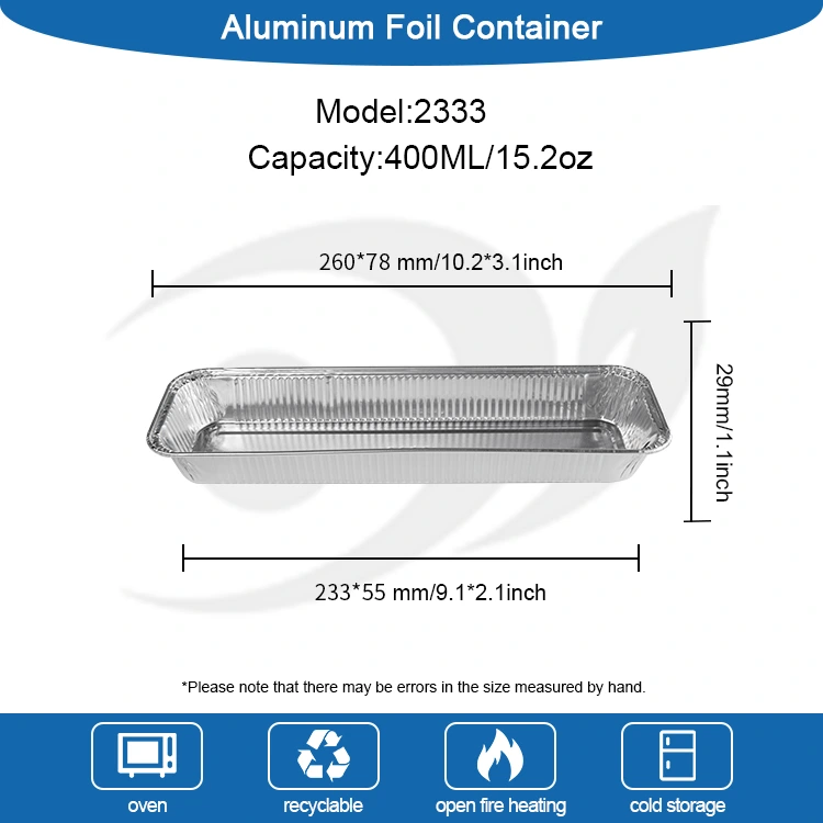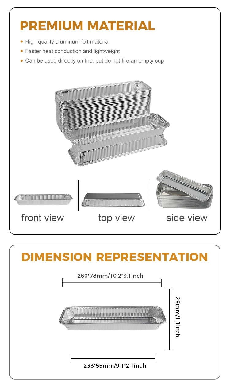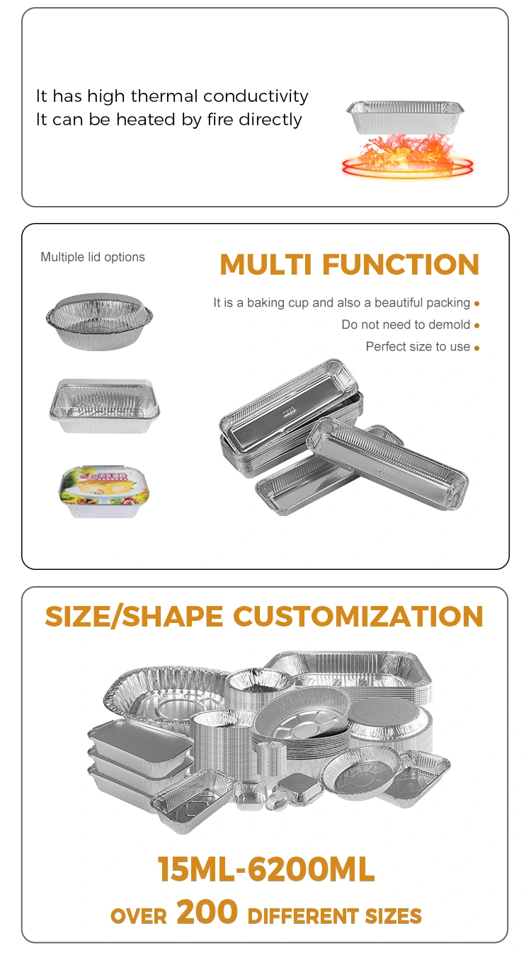 FUNKSJONER: Lunsjkassen engros er laget av 8011 aluminiumsfolie materiale, som har en god varmebeskyttelseseffekt og kan opprettholde temperaturen på maten, noe som gjør maten mer deilig og deilig. I tillegg har vår rektangulære BBQ sølv aluminiumsfoliebeholder også en varmeisolasjonsfunksjon og kan matches med aluminiumsfolie lokk og PET -plastlokk.