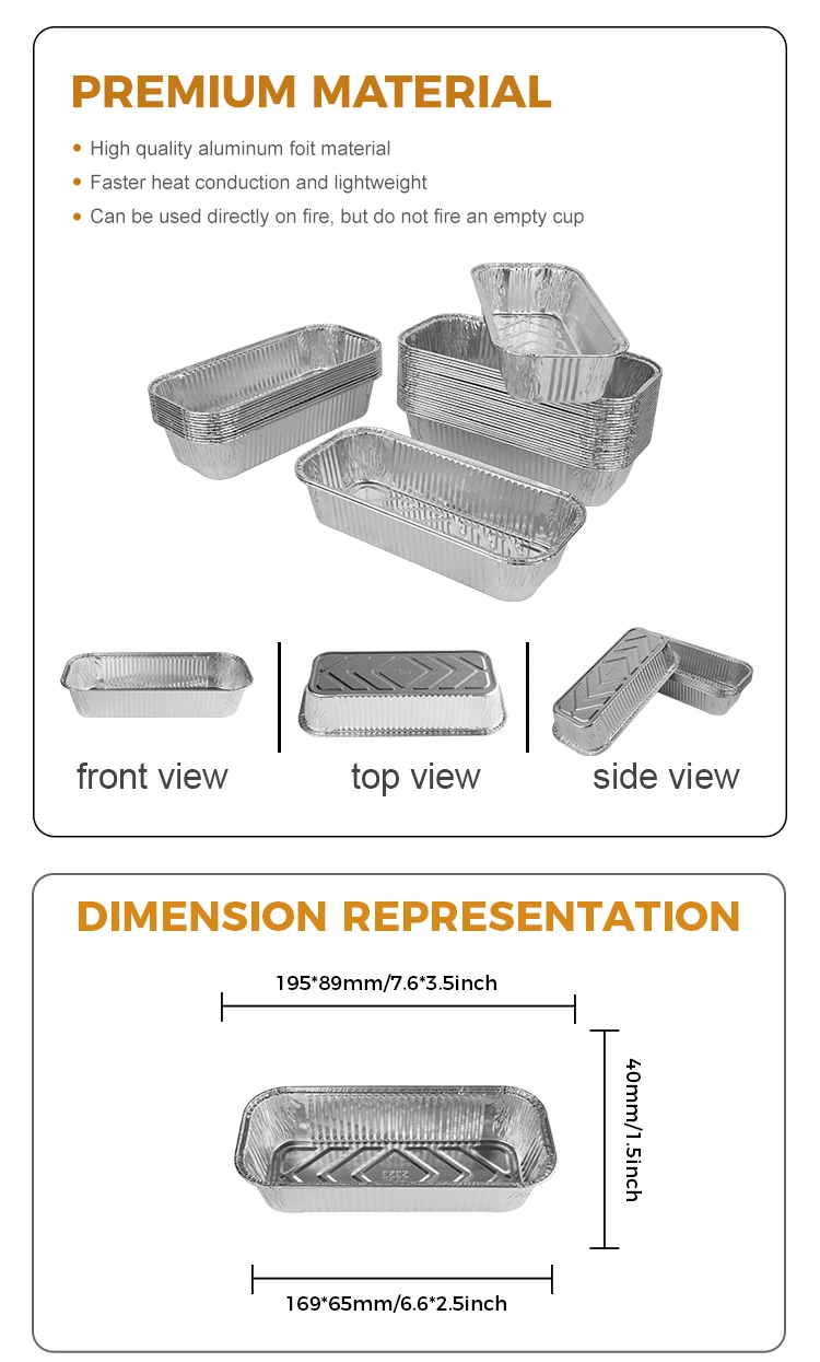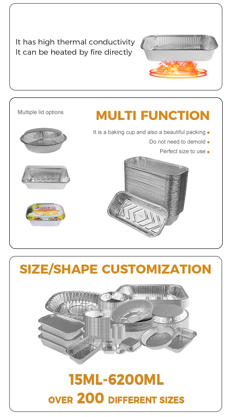 Funksjoner: Lunch Box Engros 8011 Aluminiumsfolie materiale er laget av god varmebevaring, som kan opprettholde temperaturen på maten og gjøre maten mer deilig. I tillegg har vår rektangulære grillsølv aluminiumsfoliebeholder også en varmebeskyttelsesfunksjon, som kan matches med aluminiumsfoliepapir lokk og PET -plastlokk, noe som er praktisk for deg å tilpasse logoen din, utdypere kundeinntrykk ytterligere og forbedre merkevarebildet ditt.