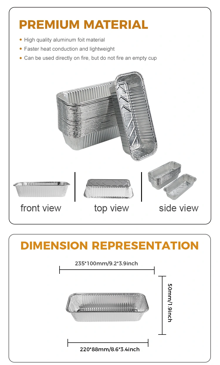 Denne beholderen er ikke bare varmebestandig og oljebestandig, men også veldig enkel å bake, noe som gjør den spesielt egnet til bruk i luftfriere og annet utstyr. Bare legg mat eller suppe i den når du bruker den uten å bekymre deg for at den tørker ut. For hjemmebrukere er det enda mer rent og praktisk, med et ikke-vaskert design som gjør rengjøring enkelt og raskt. Rektangulær BBQ tyknet sølv aluminiumsfoliebeholder er en uunnværlig hjelper på kjøkkenet ditt. Enten det er for hverdags matlaging eller spesielle anledninger, det gir den perfekte løsningen. Kom og handle for å gjøre matlagingslivet mer praktisk og deilig!