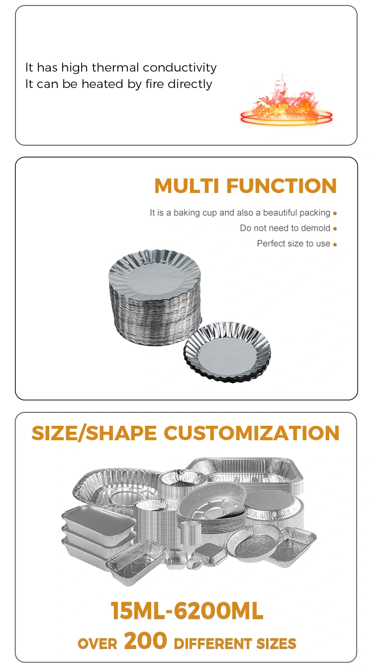 Det er verdt å nevne at runde bakekake tinn med sølv aluminiumsfolie matbeholder er veldig miljøvennlig. Laget av resirkulerbart aluminiumsfoliemateriale, etter bruk, kan du avhende det i den utpekte søppelkassen for behandling, uten å bekymre deg for å forårsake negativ innvirkning på miljøet.
