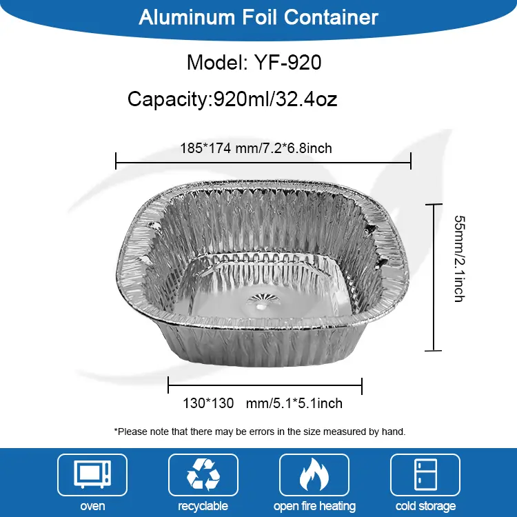 Yunchu laget i Kina Model YF920 kvadrat sølv takeaway pakking aluminiumsfoliebeholder er veldig beskjeden i størrelse, med en toppdiameter på 185*174 mm (7,2*6,8 tommer), en basediameter på 130 mm (50 mm) og en høyde på bare 52 m ( Denne størrelsen er ikke bare lett å bære, men kan også dekke en rekke forskjellige bruksbehov.
