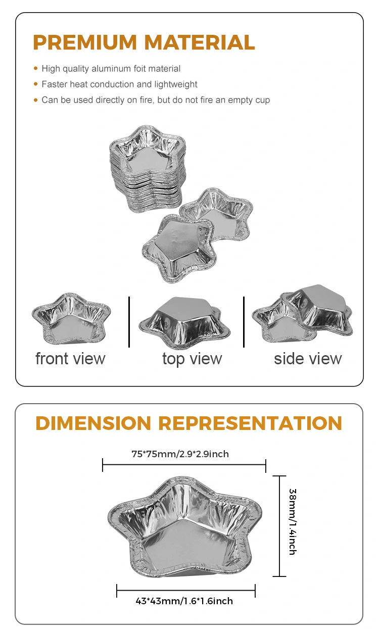 Yunchu leverandør av aluminiumsfolie Stjerneformede tertebeger av aluminiumsfolie til baking Matbeholder av aluminiumsfolie, fortykket tinn terteform av aluminiumsfolie med stabil form, laget av matvaregodkjent aluminiumsfoliemateriale, gjør det lettere å ta ut formen etter steking. Denne stjerneformede aluminiumsfoliebeger for baking av aluminiumsfolie matbeholder er høytemperaturbestandig, ikke lett å brenne eller feste, med designet og bearbeidet bunn og kanter for jevn varmeledning, fortykket og forsterket integrert støping, vanligvis brukt til luftsteking, damping, baking, etc.