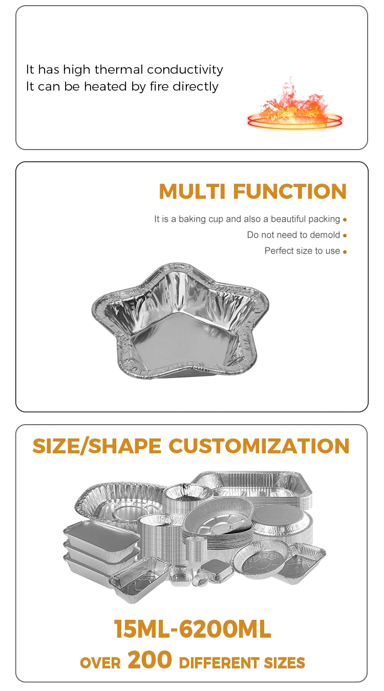 Yunchu Aluminiumsfolieleverandør Stjerneformede aluminiumsfoliebegre for baking Aluminiumsfoliematbeholder er en høykvalitets bakesølvbeholder av aluminiumsfolie. Dette produktet er praktisk og løser effektivt problemer når du lager terter eller småmat, som oppvaskpanner og fettrester. De indre og ytre veggene på bunnen av de stjerneformede aluminiumsfoliebegre for baking Matbeholder med aluminiumsfolie er utformet for å være glatt, og forhindrer at de fester seg etter steking og unngår svi i bunnen.
